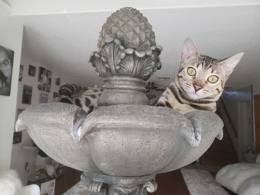 Cartier is a brown spotted tabby. She has a very unique coloring and while some say it may look silver she is a cool brown based on heredity. She has a very dark inky rosette pattern with great contrast, good; profile, ears, whisker pads, striking green eyes and a very carefree and sweet personality. Cartier enjoys playing with teasers, balls, and cat naps she has a very chill personality and loves everybody once she gets to know you. Cartier has great lines in her pedigree and has bloodlines from one of TICAS Supreme Grad Champions in her Sires side. I'm sure her traits both physically, genetically and spiritually will pass on into her mothing skills and kittens. . Cartier will be bred and we look forward to her beautiful kittens and seeing what a great Mom she will be.